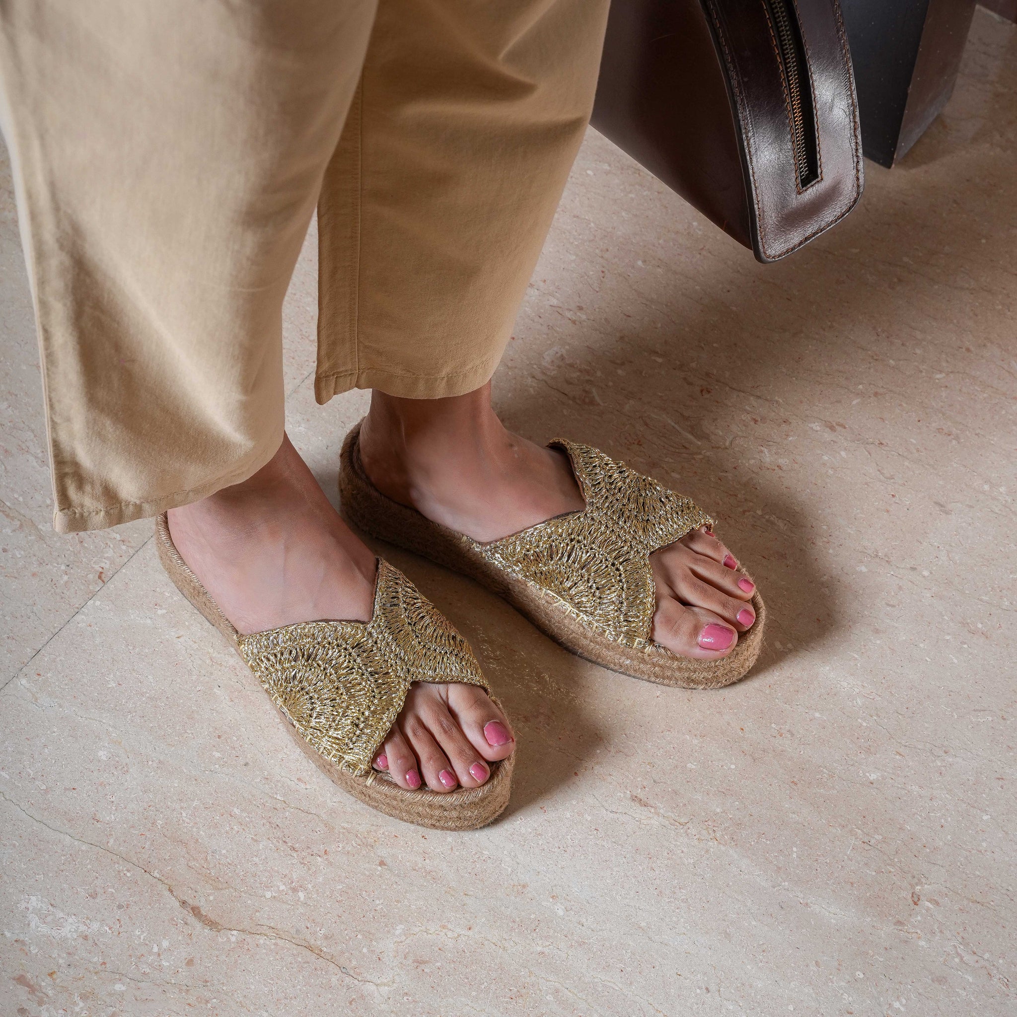 For a polished formal look, style the flats with tailored ivory or beige trousers and a structured blouse. Add a sleek low bun, a statement watch, and a structured handbag — the gold crochet adds warmth to sharp silhouettes without looking overpowering.