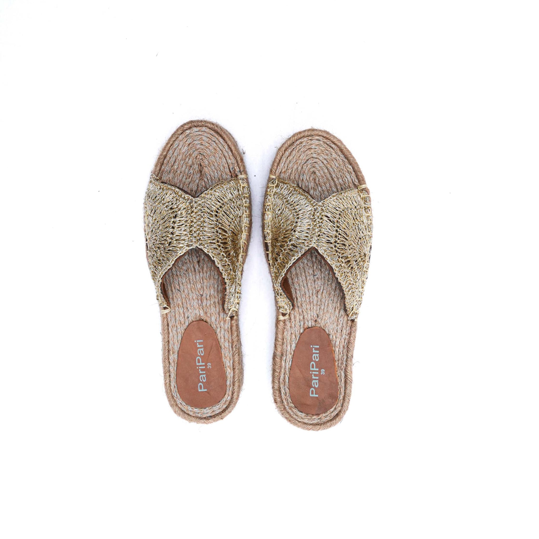 · Upper is hand-woven with crochet and gold thread with genuine leather lining.
