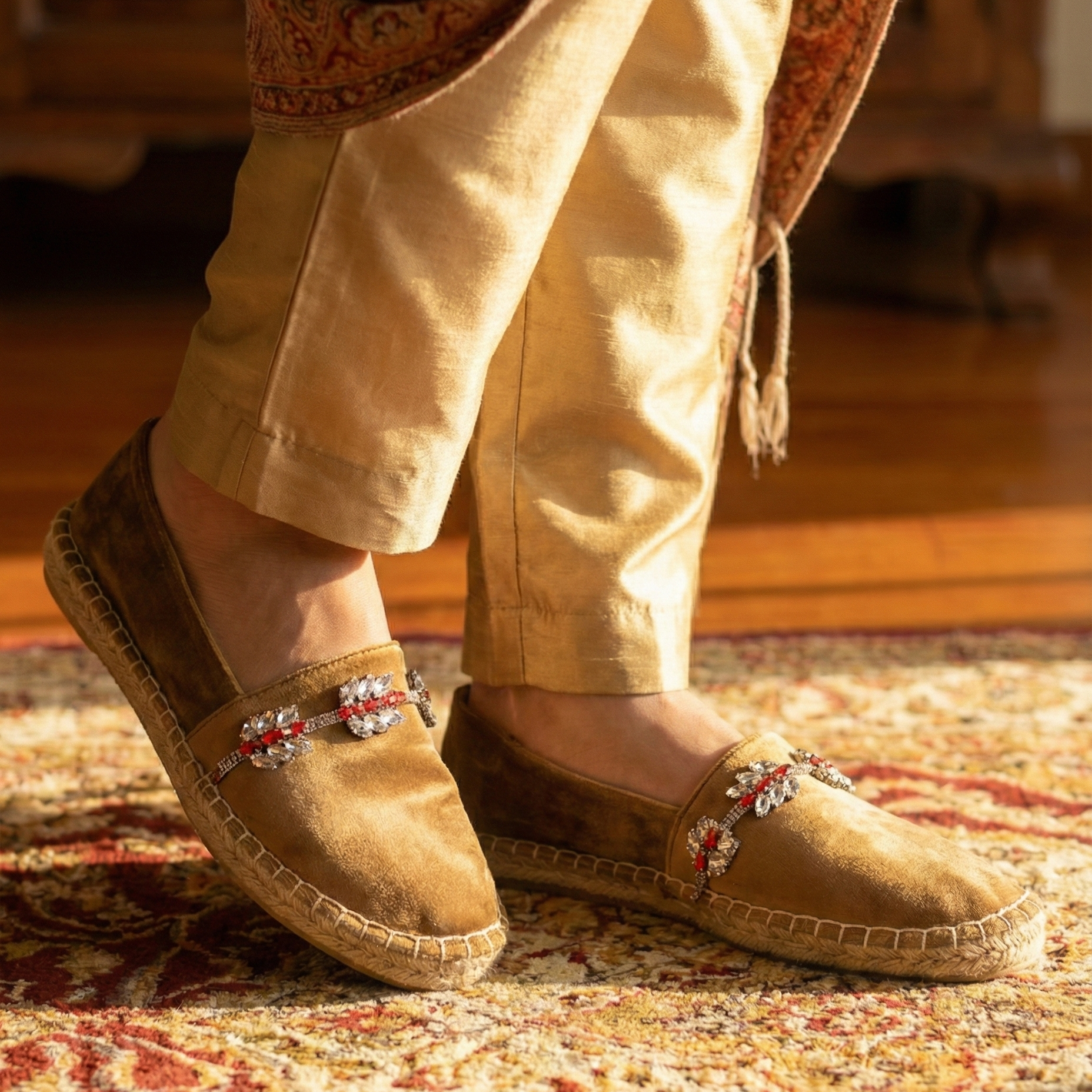 Style Aura with embroidered salwars or straight-cut suits for a classic festive look. Pair them with co-ord sets for clean, contemporary dressing with a refined edge. They work beautifully with leather pants and jeggings, adding softness to structured silhouettes. With skirts—midi or knee-length—Aura delivers graceful ease with a hint of shine. Perfect for intimate gatherings, Lohri functions, weddings, bonfire evenings, and relaxed brunches, these espadrilles move seamlessly from day to night.