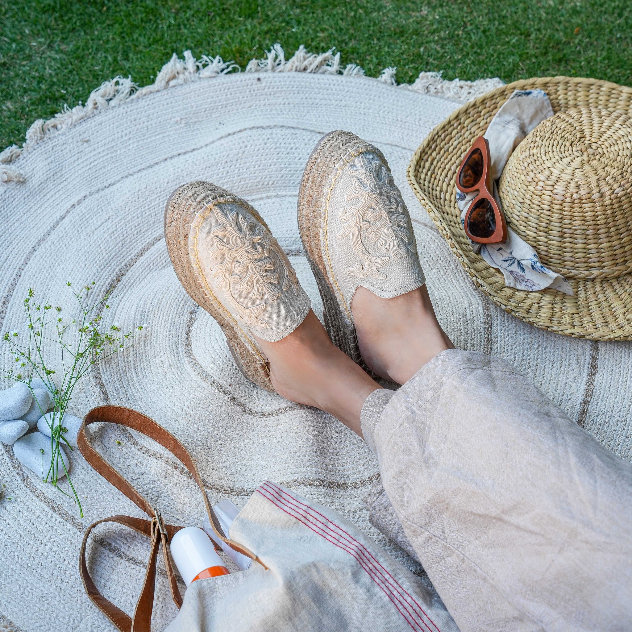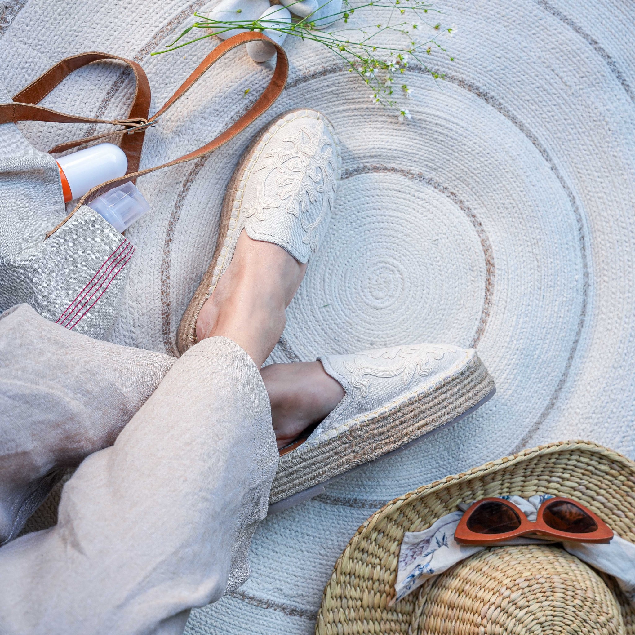 Delilah Linen Espadrilles are designed for women who love understated polish. Crafted in luxe linen and finished with delicate, unique dori embroidery, this pair carries quiet confidence in every detail.