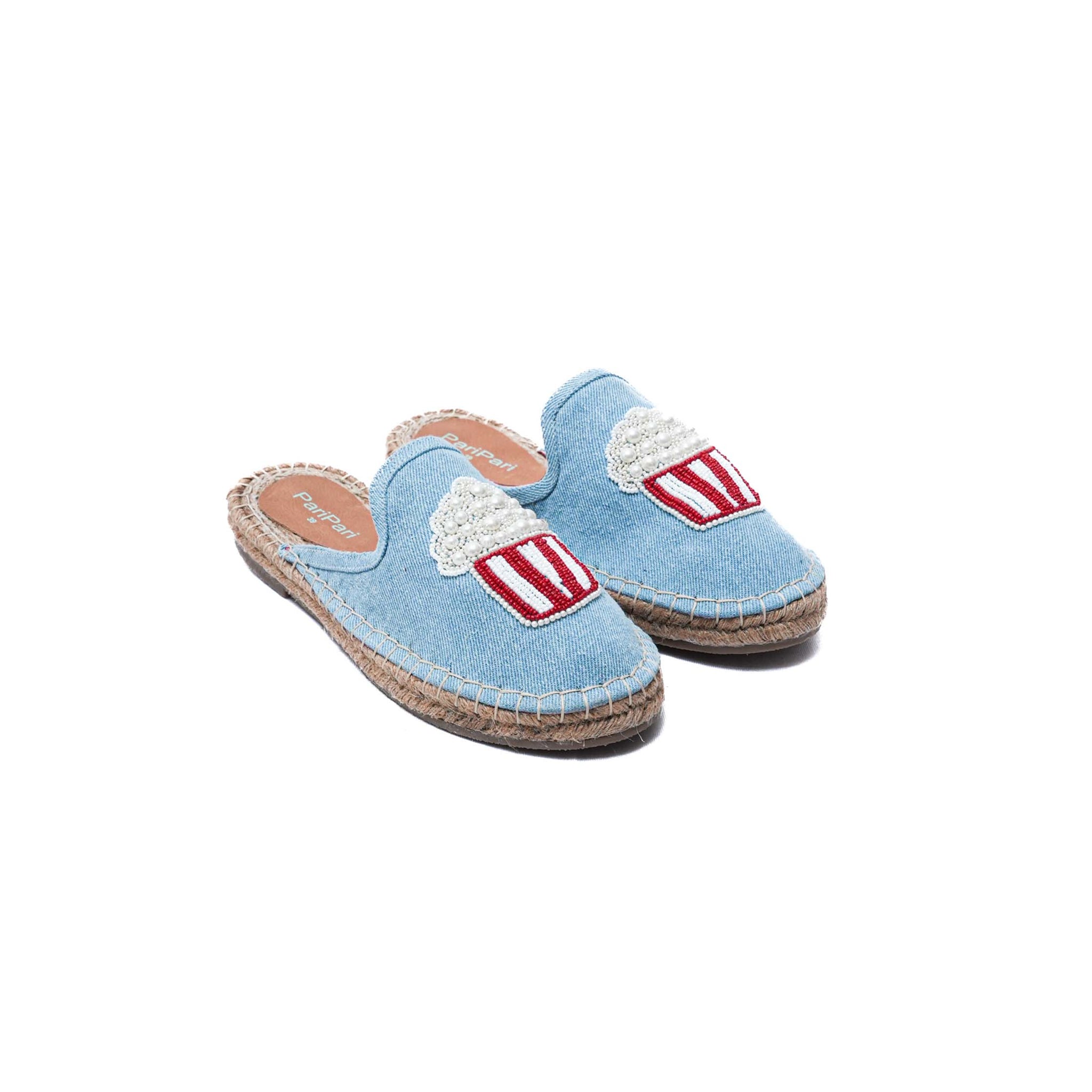 At the centre of the upper sits the star detail — a handcrafted popcorn motif created with clusters of small and big pearls, inspired by the joy of movie nights and carefree moments. Set against the breezy espadrille base, the motif adds charm without overwhelming the shoe.