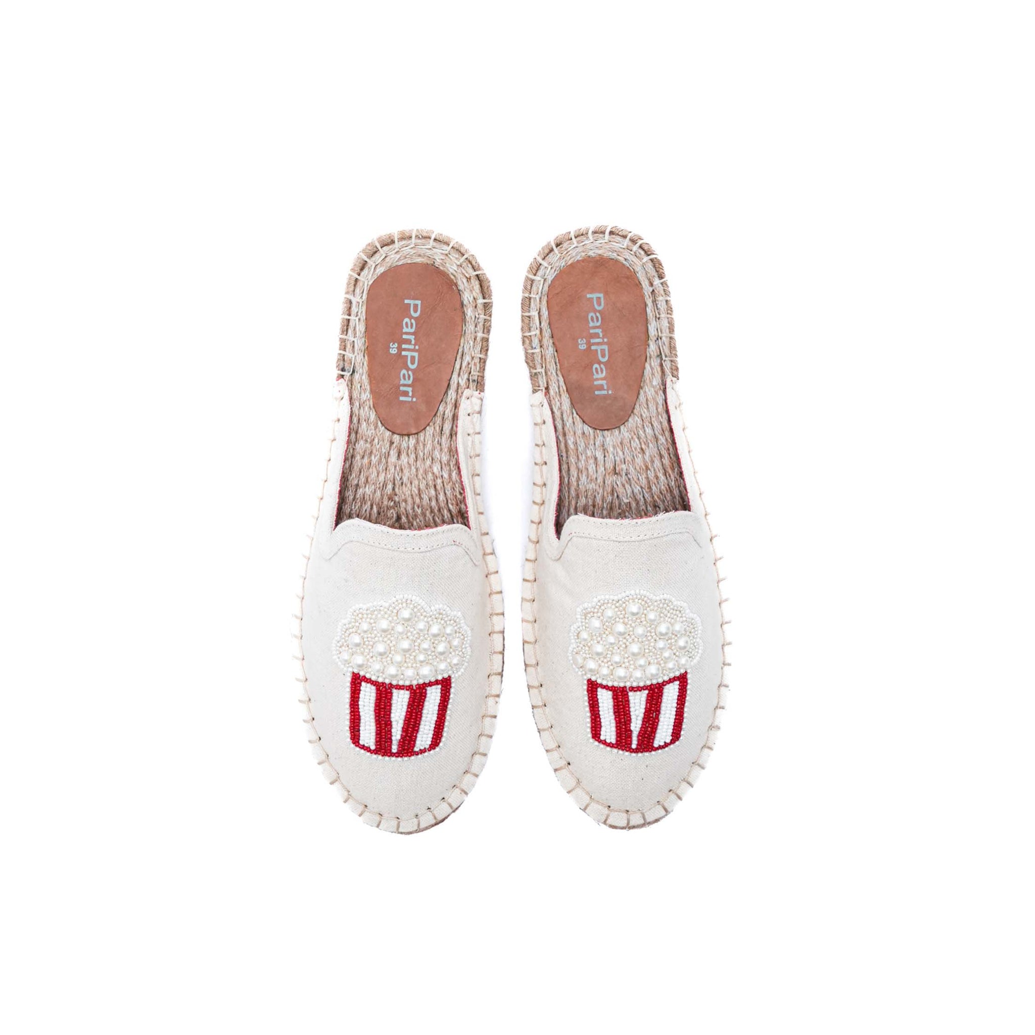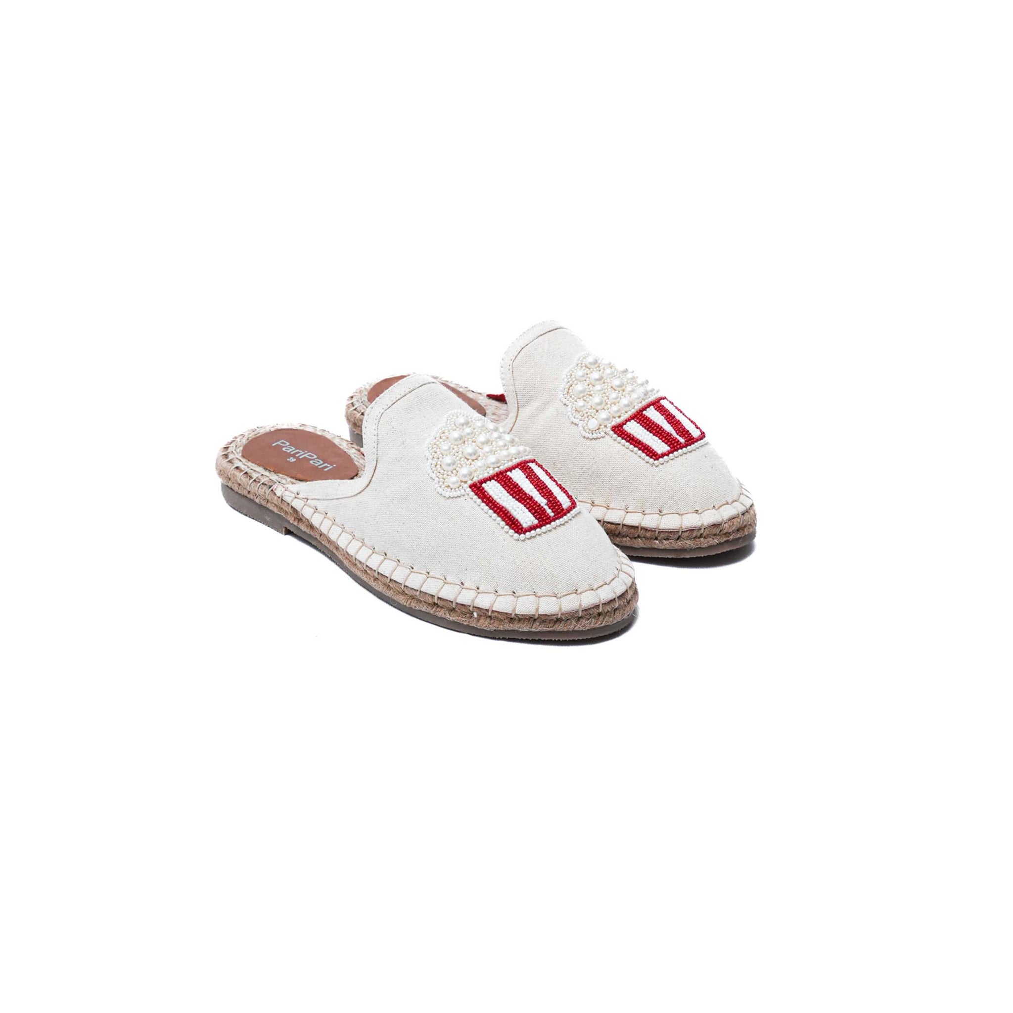 At the centre of the upper sits the star detail — a handcrafted popcorn motif created with clusters of small and big pearls, inspired by the joy of movie nights and carefree moments. Set against the breezy espadrille base, the motif adds charm without overwhelming the shoe.