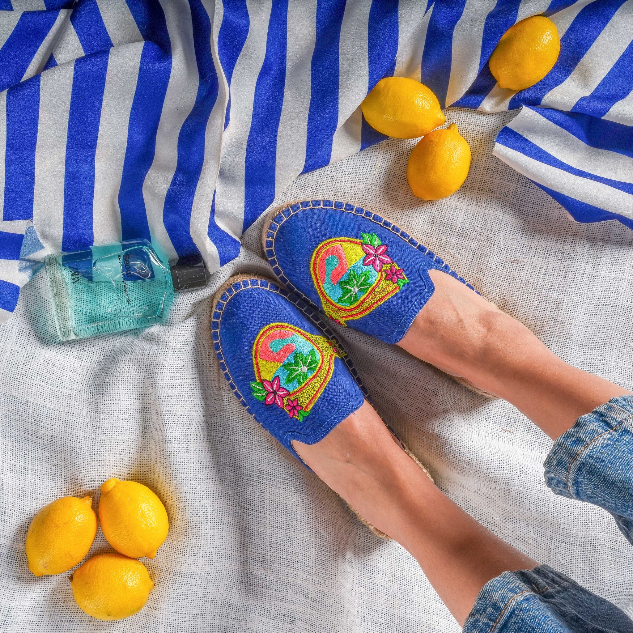 The blue pair looks stunning with white linen trousers and a bright tank. Throw on statement sunglasses (of course) to echo the embroidery and keep it playful.