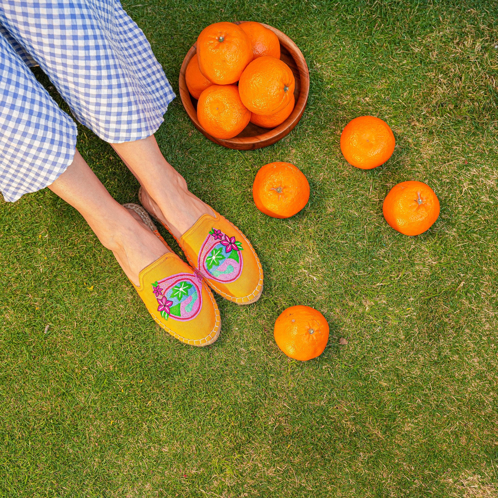 The Sunny Espadrilles are summer turned all the way up. Tangy, playful, and bursting with colour, this pair is designed to bring instant mood to your wardrobe. Available in vibrant orange and bold blue, each shoe features intricately embroidered sunglasses across the upper — cheeky, detailed, and impossible to miss.