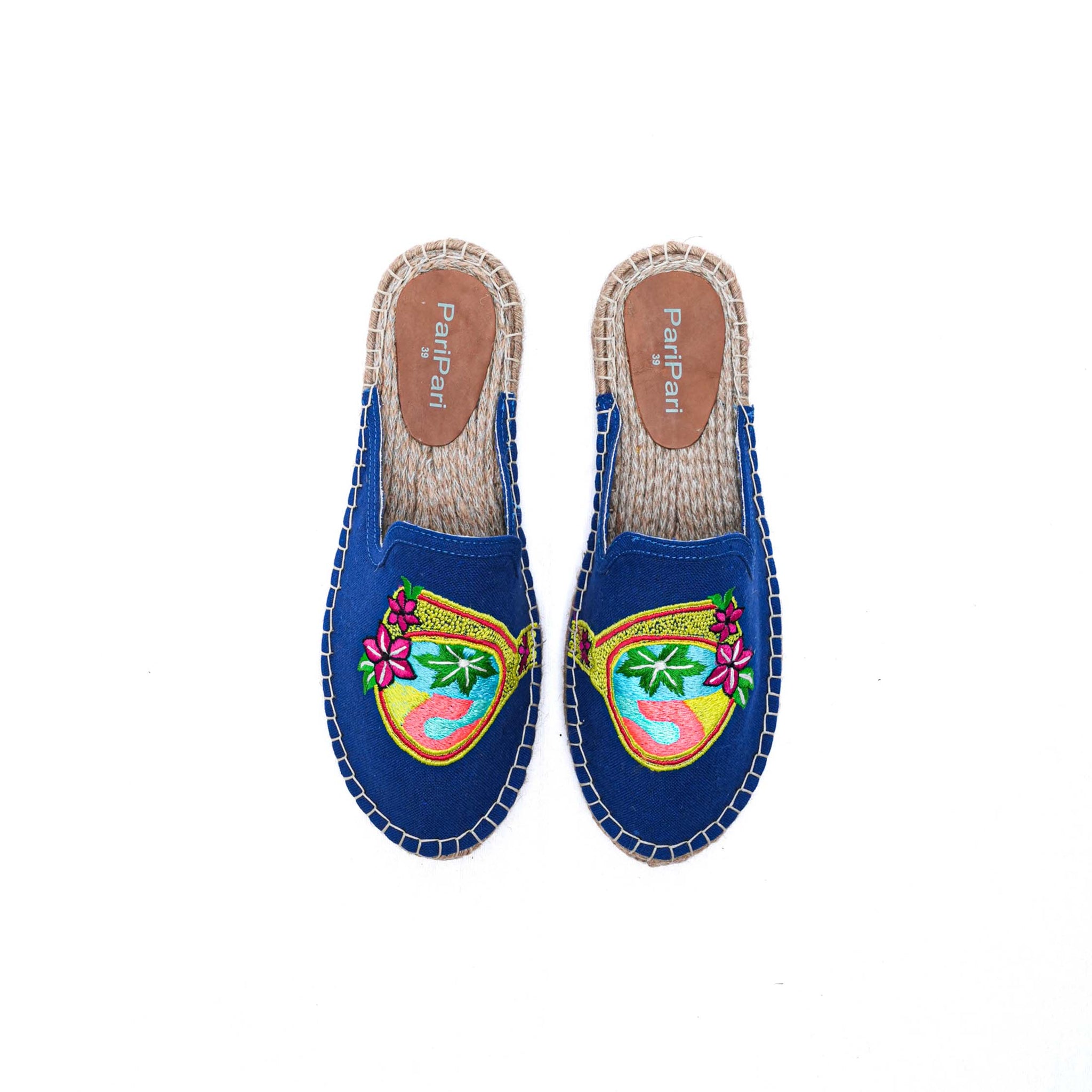 The blue pair looks stunning with white linen trousers and a bright tank. Throw on statement sunglasses (of course) to echo the embroidery and keep it playful.
